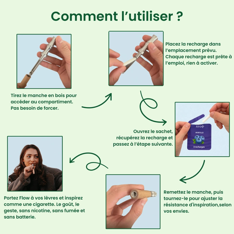 C'est la simplicité incarnée ! Il suffit d'insérer une recharge aromatisée dans votre inhalateur. Ensuite, respirez profondément pour savourer la fraîcheur et retrouver instantanément un moment de sérénité.